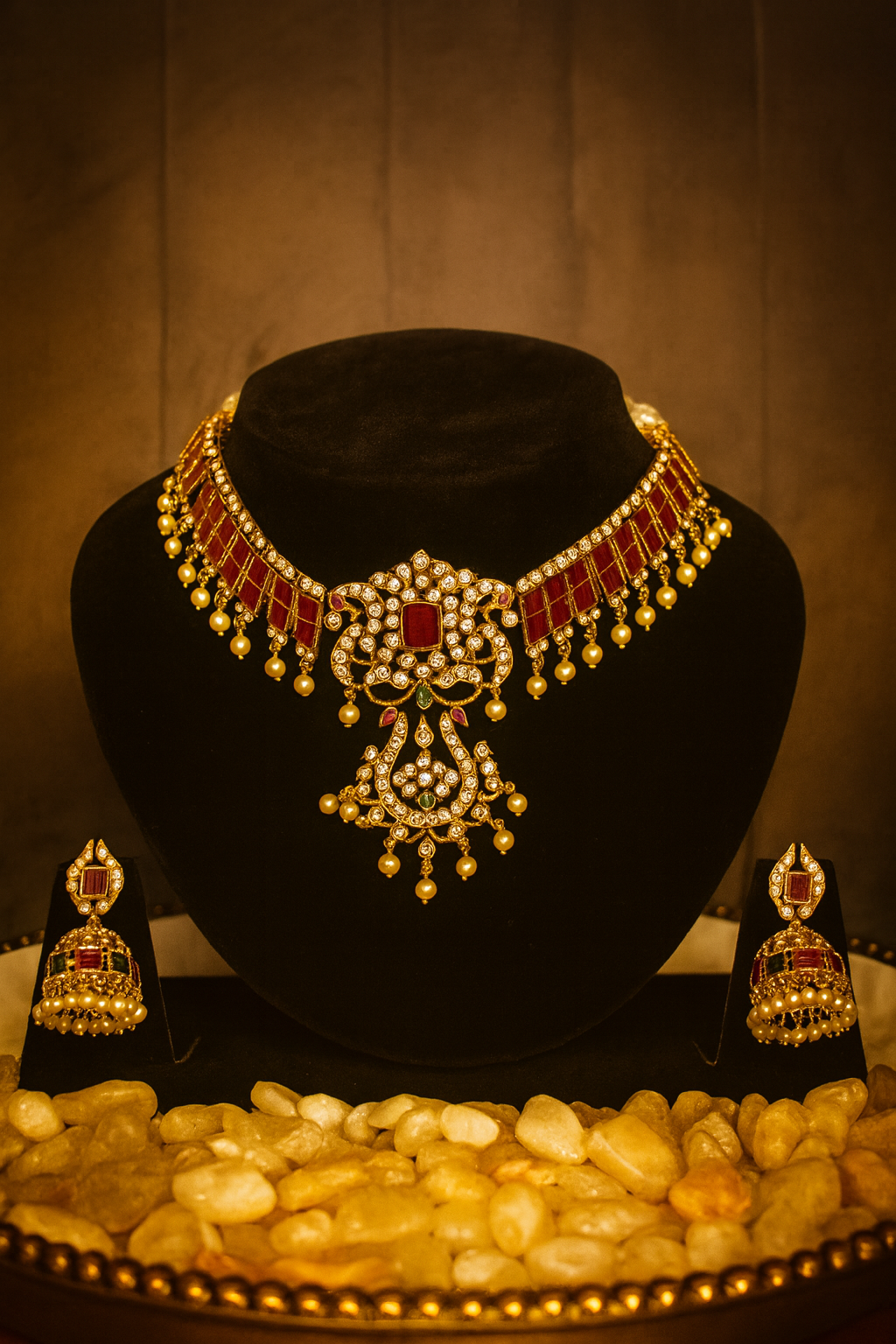 An elegant blend of ruby tones, pearls, and intricate detailing, Qamariya shines with the charm of moonlight. A statement imitation jewellery piece, perfect for weddings and festive occasions.